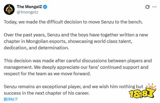 官方在聲明中將此決定描述為“艱難”。聲明中指出,Senzu在過去數年間與團隊共同“譜寫了蒙古電競的新篇章”,并盛贊其展現了“世界級的技術水平與永不言敗的競技精神”。此項陣容變更是戰隊管理層與選手本人進行深入溝通后的共同結果。
