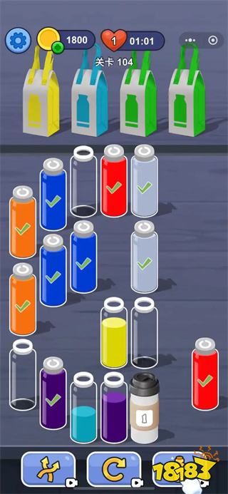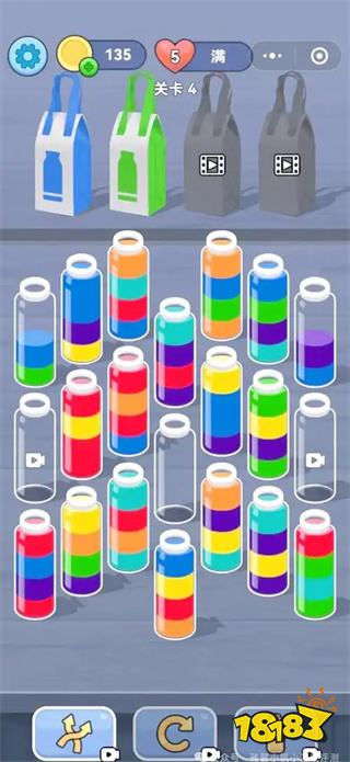 游戲規則嚴謹又有趣:你只能將某種顏色倒入同色液體的頂部,或空瓶子里。從最初兩三瓶、兩三種顏色的入門關,到后期6瓶、4種顏色的復雜局面,甚至出現“瓶子中間顏色被遮擋”的變種玩法,難度曲線悄然攀升,逼得你不得不調動全部的邏輯思維和規劃能力。